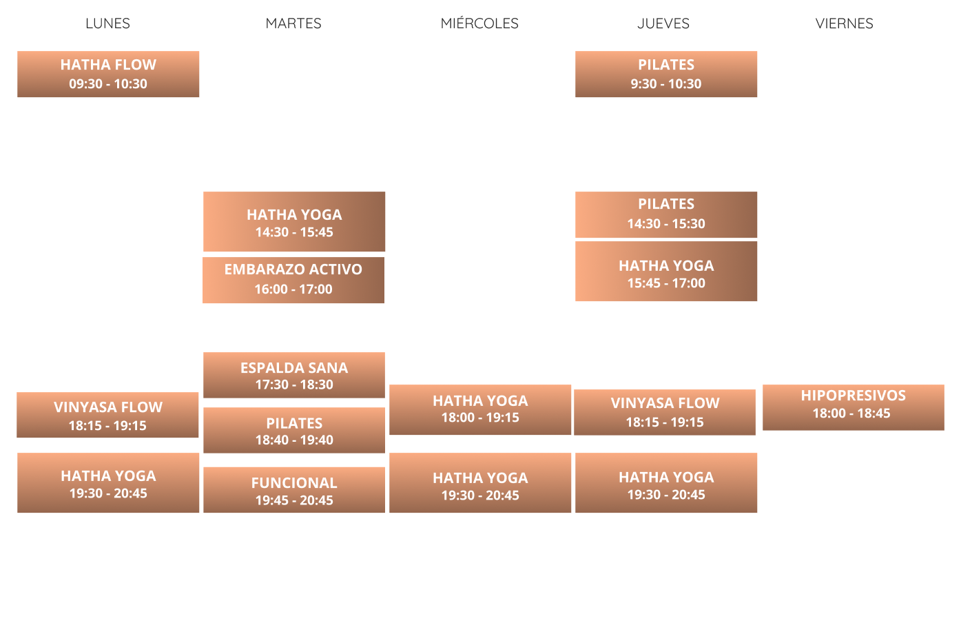 GRUPOS REGULARES Curso 25-26 nUEVO HORARIO A PARTIR DE ENERO 26 consulta disponibilidad Si te apetece comenzar a formar parte de alguna de nuestras actividades, rellena este formulario y me pondré en contacto contigo. HATHA FLOW. LUNES 9:30HHATHA FLOW. JUEVES 7:00HVINYASA FLOW. JUEVES 18:15HVINYASA FLOW. LUNES 18:15HHATHA YOGA. LUNES 19:30HHATHA YOGA. MARTES 14:30HHATHA YOGA. MIÉRCOLES 18HHATHA YOGA. MIÉRCOLES 19:30HHATHA YOGA. JUEVES 15:45HHATHA YOGA. JUEVES 19:30HPILATES. JUEVES 9:30HPILATES. JUEVES 14:30HPILATES. MARTES 18:40HPILATES. MARTES 19:45HHIPOPRESIVOS. VIERNES 18HESPALDA SANA. MARTES 17:30HEMBARAZO ACTIVO. MARTES 16:00HENTRENAMIENTO FUNCIONAL. MARTES 21:00H He leído y acepto la Política de Privacidad. Acepto recibir información promocional.